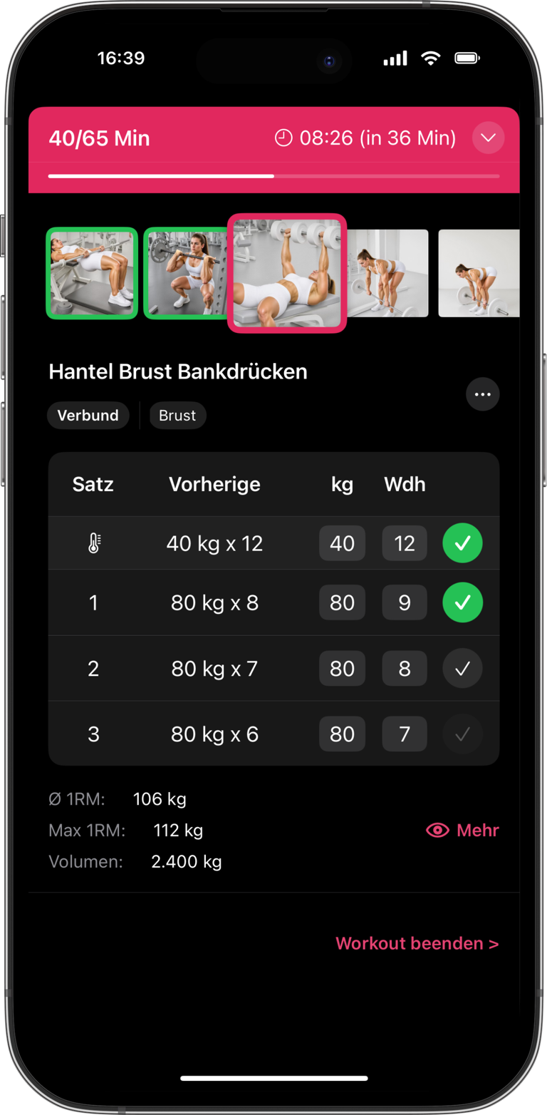 Verfolge, was zählt – von 1RM bis Körpergewicht.