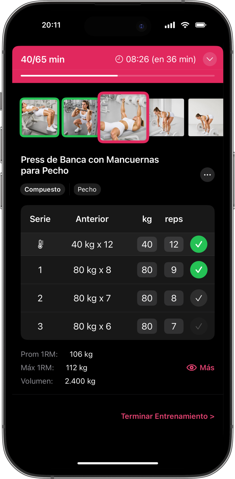 Empieza entrenamientos, registra series, usa timers y sincroniza al instante con el iPhone.
