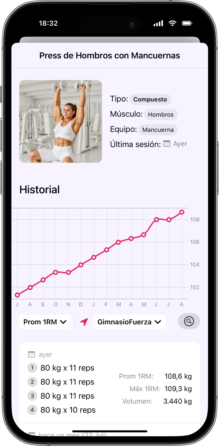 Haz seguimiento de lo que más importa, desde 1RM hasta el peso corporal.